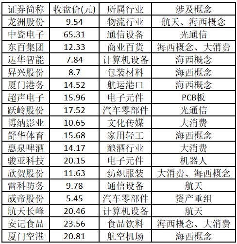 漲停板個股中,股價創(chuàng)出近一年新高的個股有18只(不包括創(chuàng)出歷史新高的個股),包括龍洲股份、中瓷電子、東百集團、達華智能、昇興股份、廈門港務(wù)、超聲電子、躍嶺股份、博納影業(yè)、舒華體育、惠泉啤酒、駿亞科技、欣賀股份、雷科防務(wù)、威帝股份、航天長峰、安記食品、廈門空港,具體如下表所示。