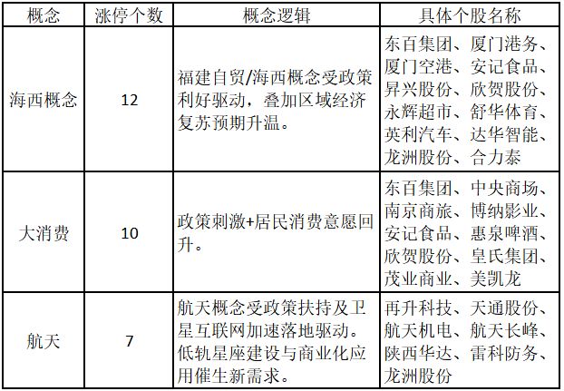從概念特征來看,今日漲停板個股中,海西概念、大消費和航天概念的個股最多。