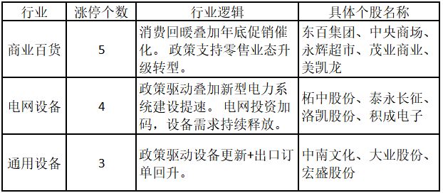 從行業(yè)特征來看,今日漲停板個股中,商業(yè)百貨、電網(wǎng)設(shè)備和通用設(shè)備行業(yè)的個股最多。