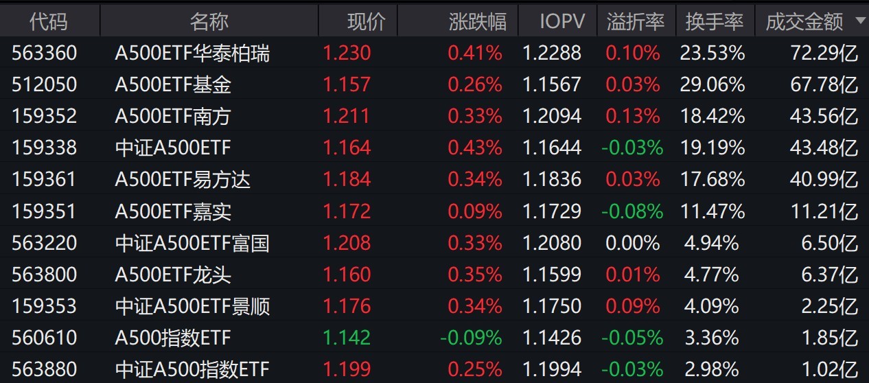 截至上午收盤,場內(nèi)跟蹤中證A500指數(shù)的ETF漲跌互現(xiàn)。其中,有11只中證A500相關(guān)ETF成交額超1億元,4只超43億元。A500ETF華泰柏瑞、A500ETF基金、A500ETF南方、中證A500ETF早盤成交額分別為72.29億元、67.78億元、43.56億元、43.48億元。