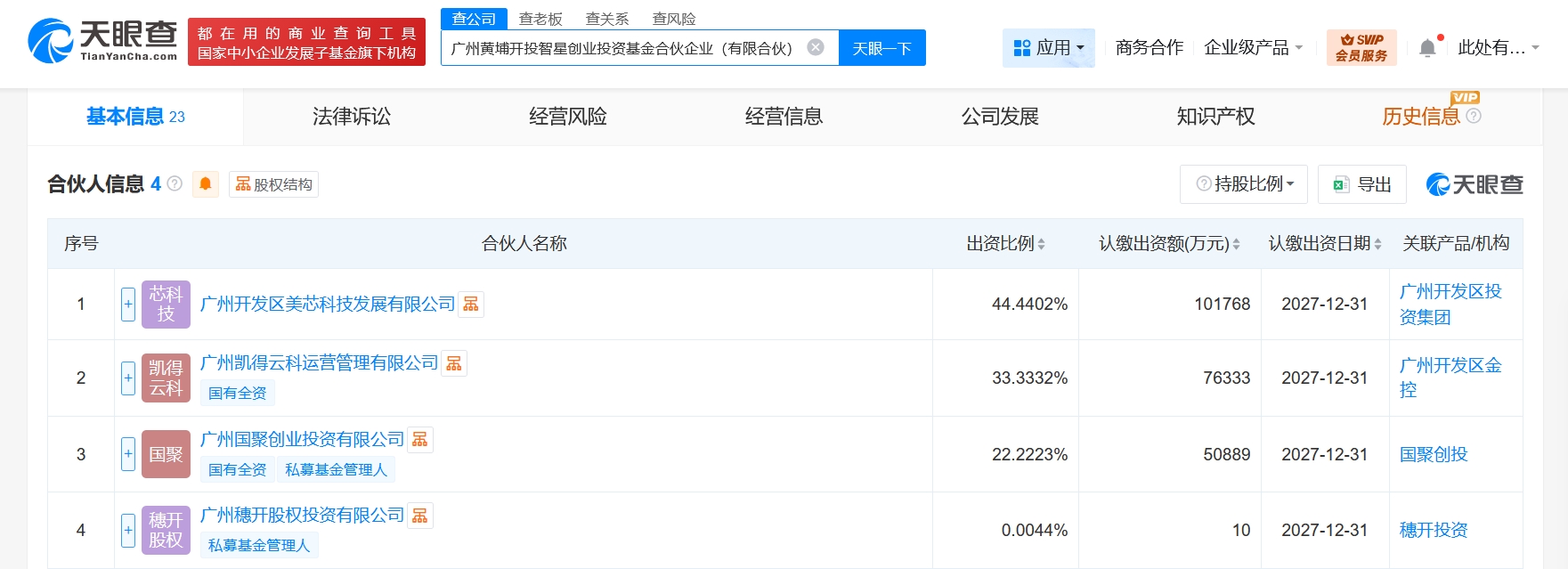 每經(jīng)AI快訊,天眼查App顯示,近日,廣州黃埔開投智星創(chuàng)業(yè)投資基金合伙企業(yè)(有限合伙)成立,執(zhí)行事務(wù)合伙人為廣州穗開股權(quán)投資有限公司,出資額22.9億元人民幣,經(jīng)營范圍為以自有資金從事投資活動(dòng),創(chuàng)業(yè)投資,以私募基金從事股權(quán)投資、投資管理、資產(chǎn)管理等活動(dòng)。合伙人信息顯示,該基金由廣州開發(fā)區(qū)美芯科技發(fā)展有限公司、廣州凱得云科運(yùn)營管理有限公司、廣州國聚創(chuàng)業(yè)投資有限公司、廣州穗開股權(quán)投資有限公司共同出資。