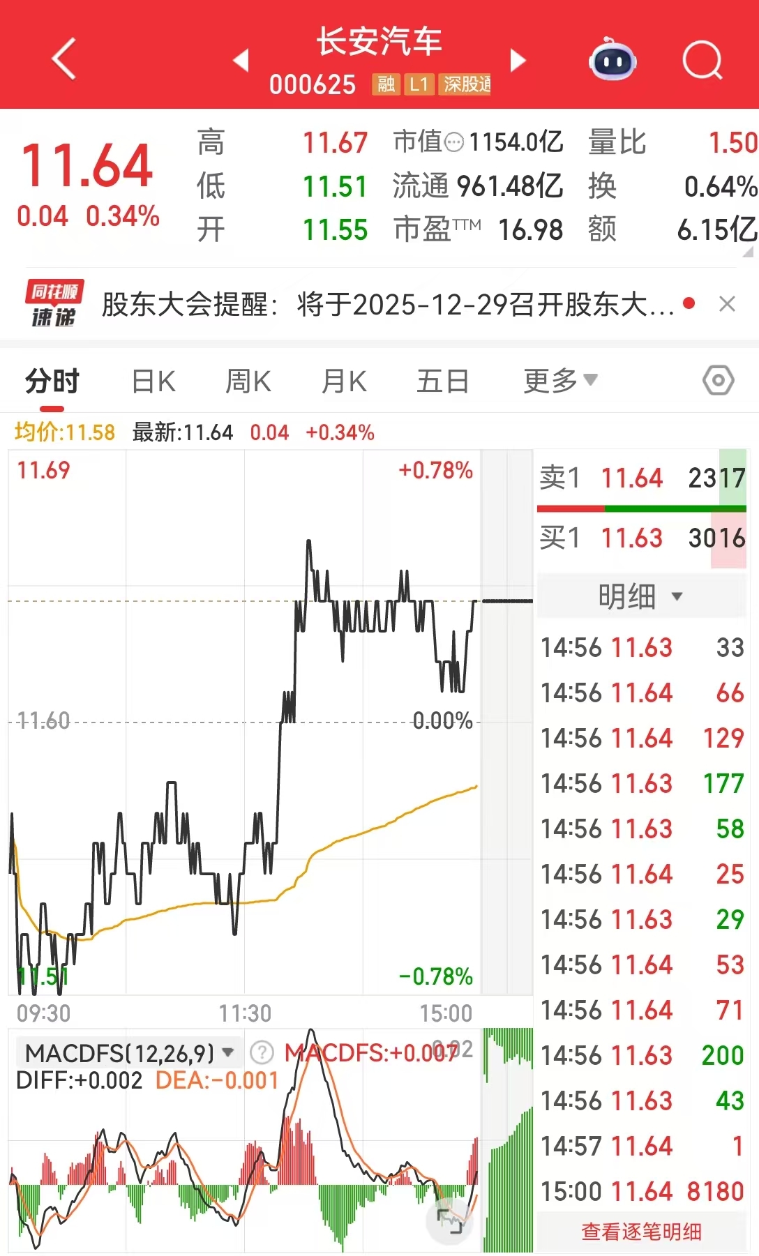 截至12月12日收盤,長(zhǎng)安汽車A股股價(jià)報(bào)11.64元/股,總市值為1154億元。