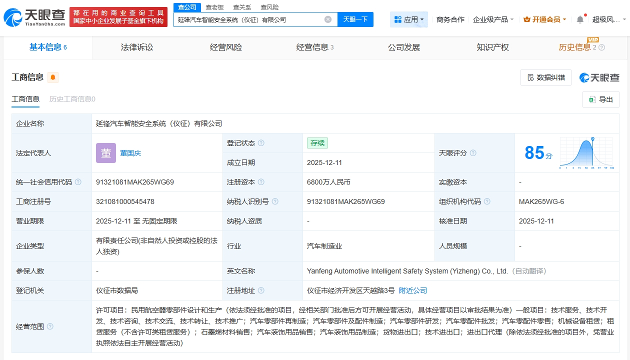 每經(jīng)AI快訊,天眼查App顯示,近日,延鋒汽車智能安全系統(tǒng)(儀征)有限公司成立,法定代表人為董國(guó)慶,注冊(cè)資本6800萬(wàn)元人民幣,經(jīng)營(yíng)范圍包括民用航空器零部件設(shè)計(jì)和生產(chǎn)、汽車零部件及配件制造、石墨烯材料銷售、汽車裝飾用品銷售等。股權(quán)全景穿透圖顯示,該公司由華域汽車(600741)旗下延鋒汽車智能安全系統(tǒng)有限責(zé)任公司全資持股。