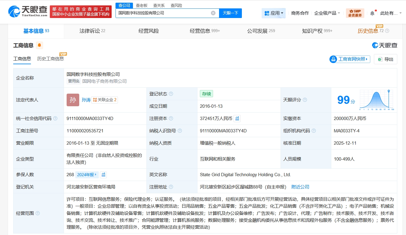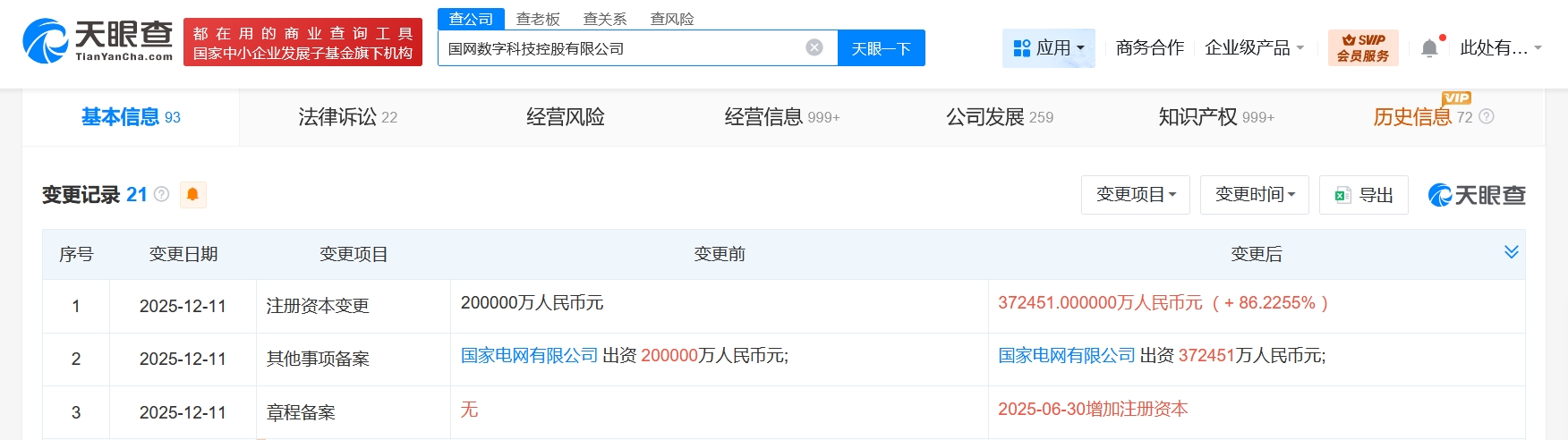 每經(jīng)AI快訊,天眼查App顯示,近日,國網(wǎng)數(shù)字科技控股有限公司發(fā)生工商變更,注冊資本由20億元人民幣增至約37.2億元人民幣,增幅約86%。該公司成立于2016年1月,法定代表人為孫濤,經(jīng)營范圍含互聯(lián)網(wǎng)信息服務(wù)、保險代理業(yè)務(wù)、企業(yè)總部管理、以自有資金從事投資活動、日用品銷售、五金產(chǎn)品零售、電子產(chǎn)品銷售、機械設(shè)備銷售、計算機軟硬件及輔助設(shè)備零售等,由國家電網(wǎng)有限公司全資持股。
