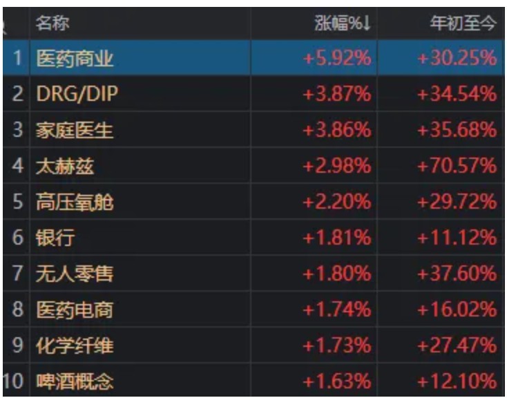 板塊方面,醫(yī)藥商業(yè)、銀行、零售等板塊漲幅居前,電池、電網(wǎng)設(shè)備等板塊跌幅居前。
