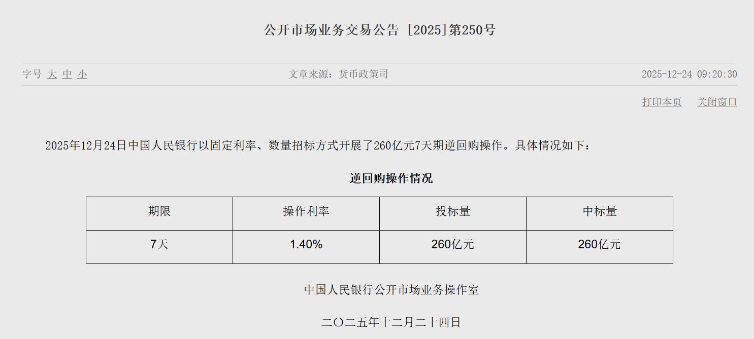 12月24日,央行公告,為保持銀行體系流動性充裕,2025年12月25日,中國人民銀行將以固定數(shù)量、利率招標(biāo)、多重價位中標(biāo)方式開展4000億元MLF操作,期限為1年期。