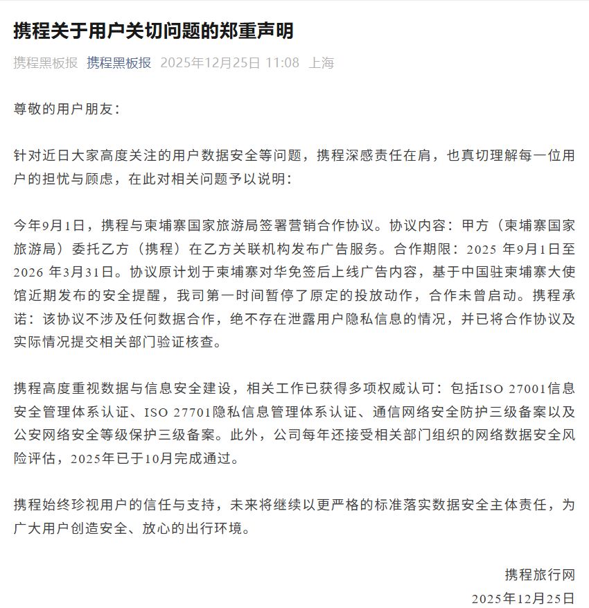 12月25日攜程就用戶數(shù)據(jù)安全等問題發(fā)布聲明,稱今年9月1日與柬埔寨國(guó)家旅游局簽營(yíng)銷合作協(xié)議,原計(jì)劃柬對(duì)華免簽后上線廣告,現(xiàn)因中使館安全提醒暫停投放,合作未啟動(dòng)。攜程承諾協(xié)議不涉數(shù)據(jù)合作,無(wú)泄露用戶隱私情況,已提交相關(guān)部門驗(yàn)證核查。