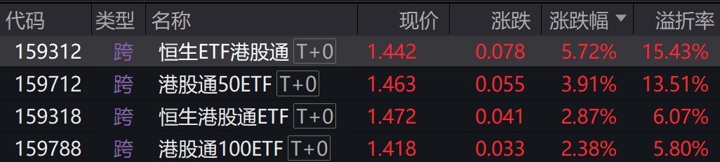 部分港股相關(guān)ETF早盤再度活躍,恒生ETF港股通漲超5%,溢價超15%。