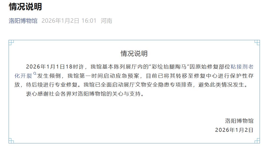 1月2日,洛陽博物館發(fā)布情況說明:1月1日18時許,我館基本陳列展廳內(nèi)的“彩繪抬腿陶馬”因原始修復(fù)部位粘接劑老化開裂發(fā)生傾倒,我館第一時間啟動應(yīng)急預(yù)案,目前已將其轉(zhuǎn)移至修復(fù)中心進行保護性存放,待后續(xù)進行專業(yè)修復(fù)。我館已全面啟動展廳文物安全隱患專項排查,避免此類情況發(fā)生。
