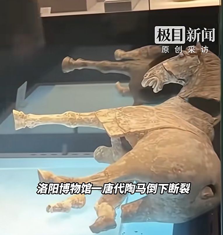 網(wǎng)友發(fā)布的圖片顯示,玻璃展柜中,這匹馬側(cè)倒在一旁,后腿已經(jīng)斷裂,斷裂的殘肢也倒在了旁邊。據(jù)介紹,這匹陶馬為唐代文物,1988年4月偃師市政府招待所出土,后藏于洛陽博物館。