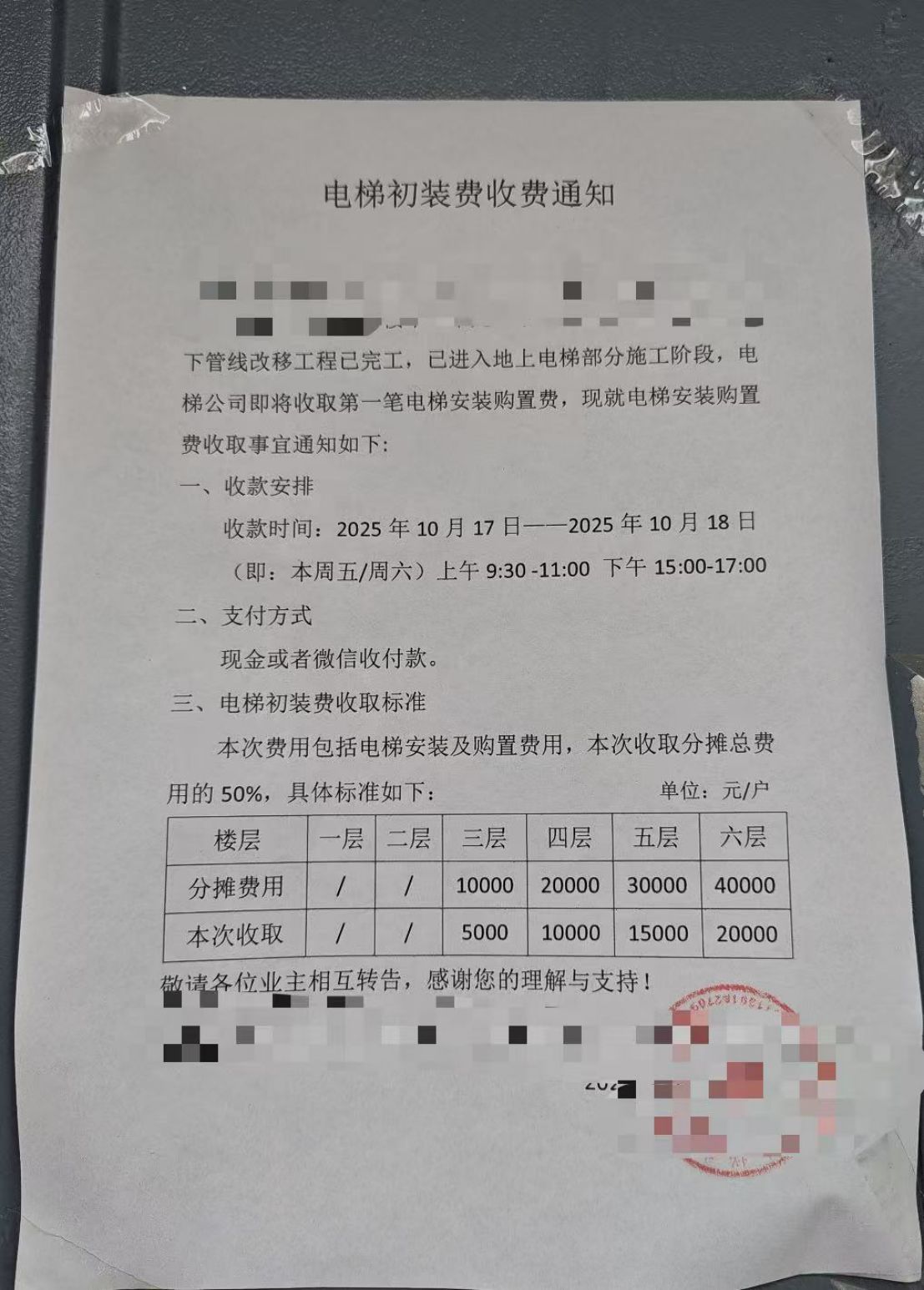 以每經(jīng)記者獲取的一份順義區(qū)某小區(qū)電梯初裝費收費通知為參考,電梯公司向業(yè)主收取總費用的50%,其中六層業(yè)主分攤費用總計4萬元,需分攤2萬元;五層業(yè)主總計3萬元,需分攤1.5萬元;以此類推,一層和二層業(yè)主暫無需分攤。