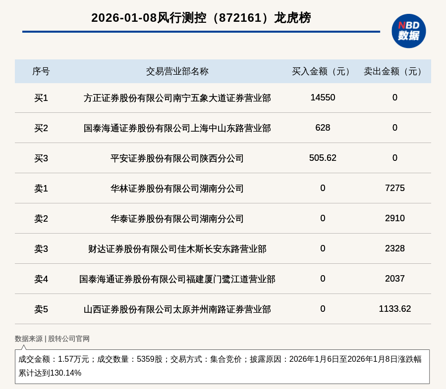 每經(jīng)訊,2026年1月8日,新三板創(chuàng)新層公司風(fēng)行測控(872161,收盤價:3.36元)登上龍虎榜,交易方式是集合競價,披露原因是2026年1月6日至2026年1月8日漲跌幅累計達(dá)到130.14%,成交數(shù)量5359股,成交金額1.57萬元。買一席位為方正證券股份有限公司南寧五象大道證券營業(yè)部,買入1.46萬元;賣一席位為華林證券股份有限公司湖南分公司,賣出7275元。