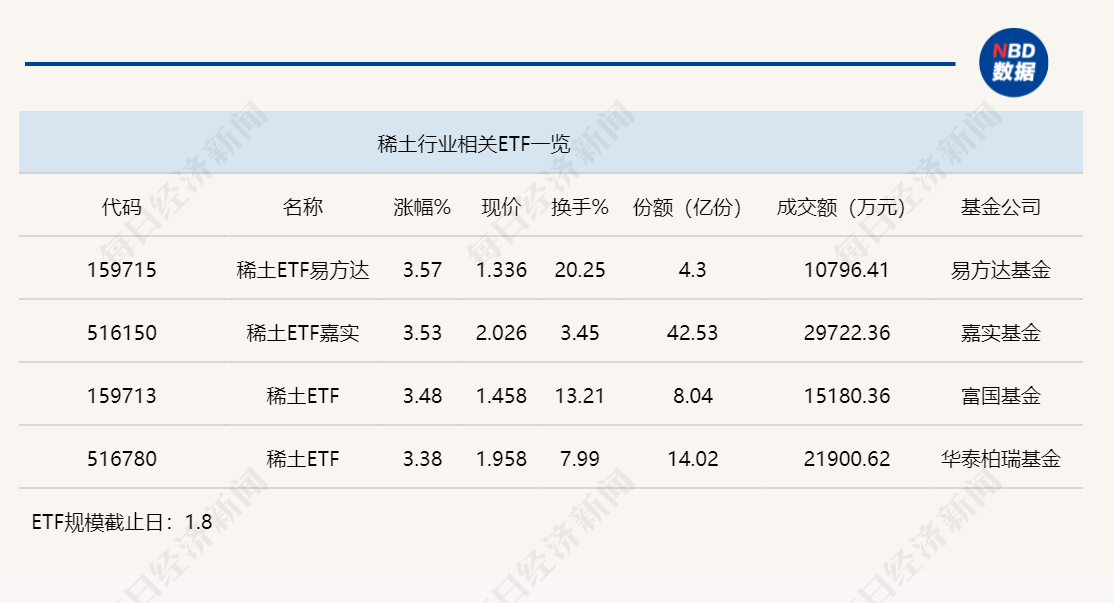點(diǎn)評(píng):稀土ETF易方達(dá)(159715)和稀土ETF嘉實(shí)(516150)今日上午分別上漲3.57%和3.53%,其中,稀土ETF嘉實(shí)(516150)規(guī)模較大,其份額達(dá)到42.53億份,半日成交金額為2.97億元,該ETF追蹤的是中證稀土產(chǎn)業(yè)指數(shù),追蹤該指數(shù)的ETF還包括稀土ETF(159713)和稀土ETF(516780)。