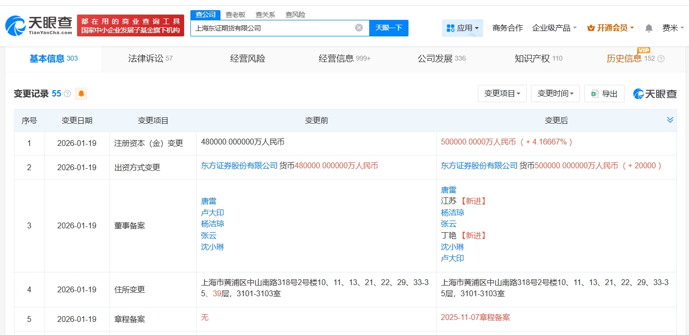 每經(jīng)AI快訊,天眼查工商信息顯示,近日,上海東證期貨有限公司發(fā)生工商變更,注冊(cè)資本由48億元人民幣增至50億元人民幣,增幅約4%,同時(shí),部分主要人員發(fā)生變更。上海東證期貨有限公司成立于1995年12月,法定代表人為盧大印,經(jīng)營(yíng)范圍包括商品期貨經(jīng)紀(jì),金融期貨經(jīng)紀(jì),期貨投資咨詢等。股東信息顯示,該公司由東方證券(600958)全資持股。