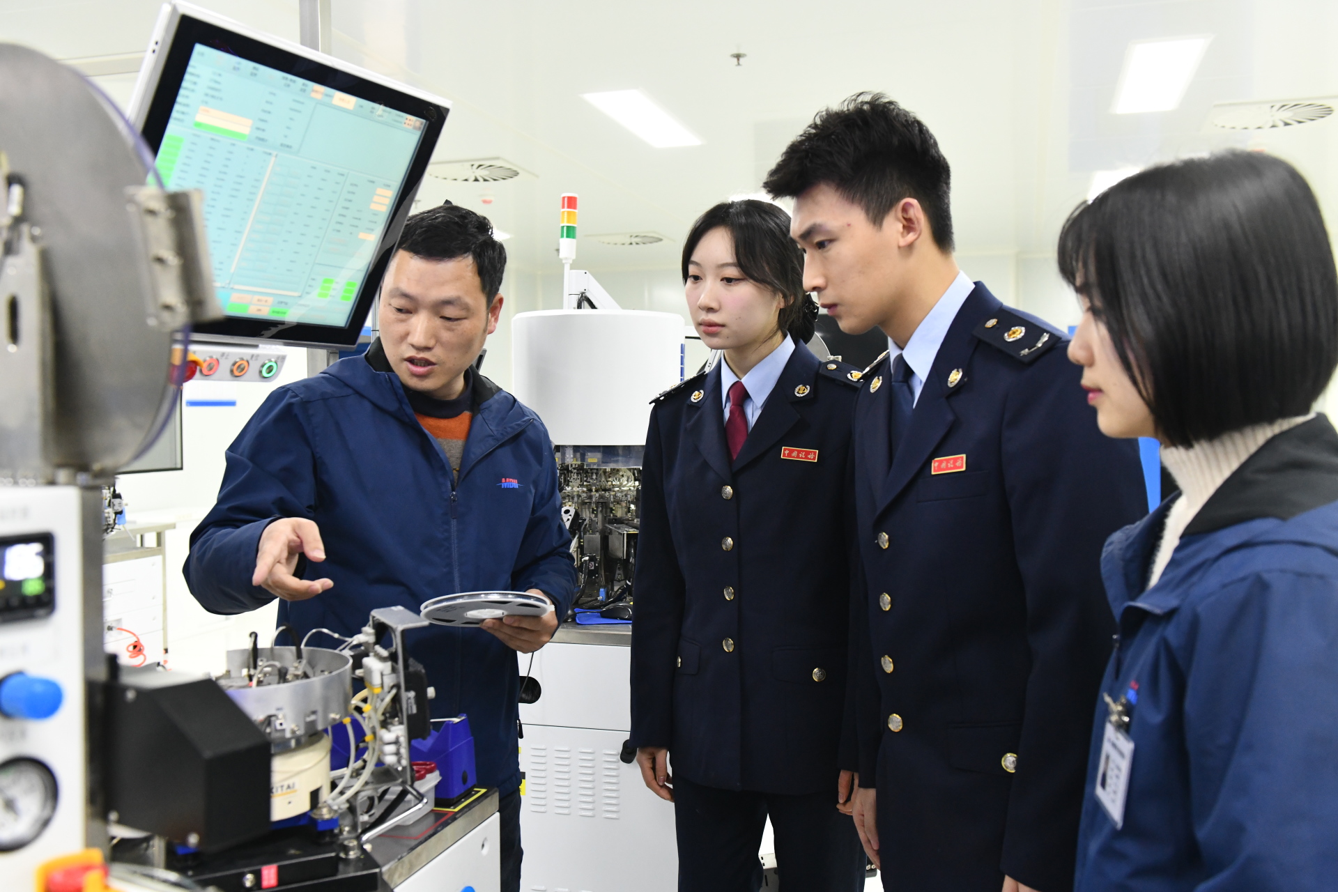 四川明德亨電子科技有限公司工作人員向稅務(wù)人員介紹芯片生產(chǎn)情況 四川省稅務(wù)局供圖