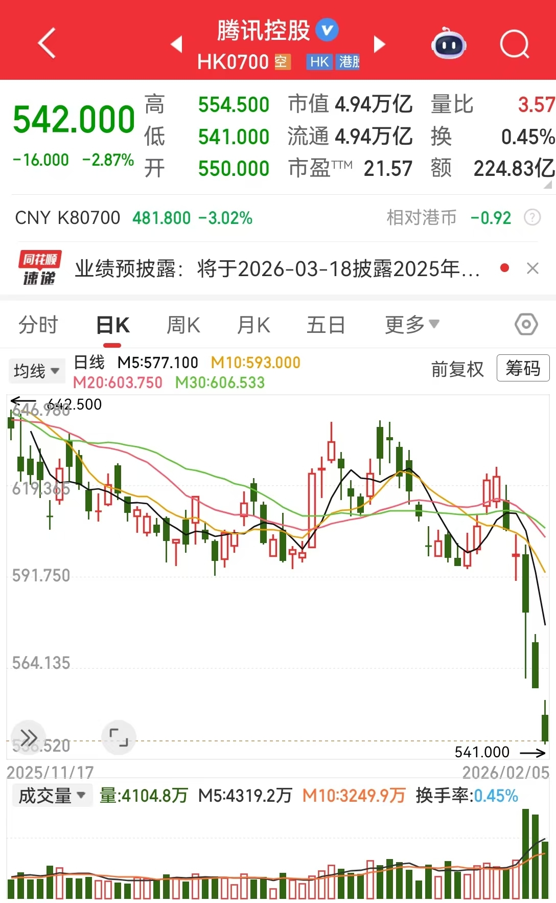 截至2月5日發(fā)稿,騰訊控股(HK0700)跌幅近3%,5個交易日跌近13%。