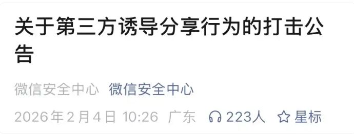 2月4日,微信安全中心發(fā)文,近期發(fā)布《針對第三方違規(guī)行為的打擊公告》,對以春節(jié)為主題集中爆發(fā)的過度營銷、誘導(dǎo)分享等違規(guī)行為進(jìn)行打擊。