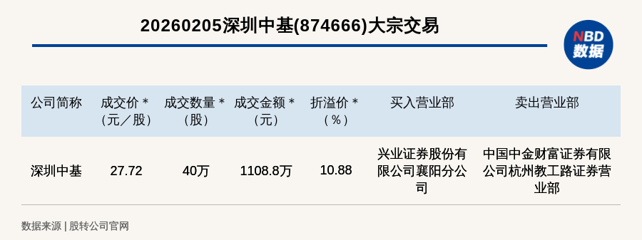 每經(jīng)訊,2026年2月5日,新三板基礎層公司深圳中基(874666,收盤價:25元)發(fā)生一筆大宗交易,成交價27.72元/股,成交數(shù)量40萬股,成交金額1108.8萬元,溢價10.88%。買入營業(yè)部是興業(yè)證券股份有限公司襄陽分公司,賣出營業(yè)部是中國中金財富證券有限公司杭州教工路證券營業(yè)部。