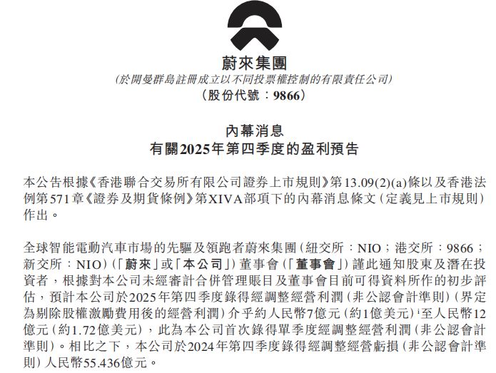 2月5日,蔚來(lái)發(fā)布2025年第四季度盈利預(yù)告,預(yù)計(jì)經(jīng)調(diào)整經(jīng)營(yíng)利潤(rùn)7億至12億元,首次實(shí)現(xiàn)單季度盈利,而2024年同期虧損55.436億元。盈利歸因于銷量增長(zhǎng)、產(chǎn)品組合優(yōu)化及降本增效。2025年蔚來(lái)交付新車約32.6萬(wàn)輛,四季度交付量創(chuàng)新高。董事長(zhǎng)李斌曾多次表達(dá)信心,并提出2026年全年盈利目標(biāo)。受此消息影響,蔚來(lái)美股盤前漲幅超10%。