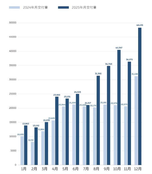 官方數(shù)據(jù)顯示,2025年,蔚來(lái)累計(jì)交付約32.6萬(wàn)輛新車。其中,2025年第四季度交付量約12.48萬(wàn)輛,創(chuàng)歷史新高,同比增長(zhǎng)71.7%,對(duì)公司全年交付量貢獻(xiàn)度超38%。