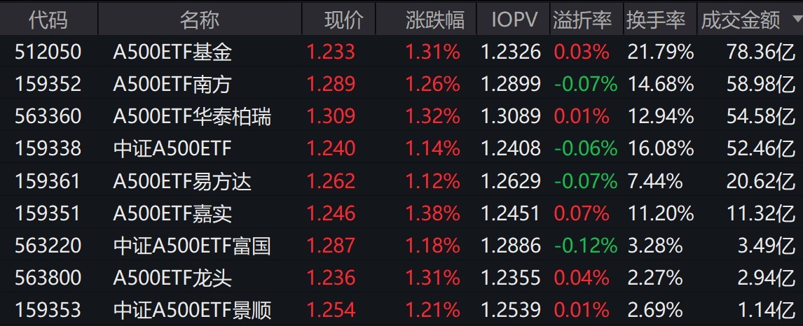 截至上午收盤,場(chǎng)內(nèi)跟蹤中證A500指數(shù)的ETF漲超1%。其中,有9只中證A500相關(guān)ETF成交額超1億元,2只超58億元。A500ETF基金、A500ETF南方早盤成交額分別為78.36億元、58.98億元。