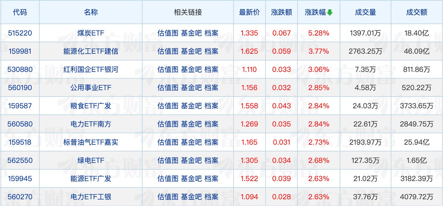 具體來看,煤炭ETF領漲5.28%。綠電概念爆發(fā),綠發(fā)電力、華電能源3連板,協(xié)鑫能科、大唐發(fā)電等多股漲停,電力相關ETF走強。
