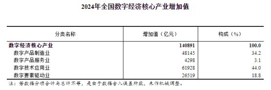 根據(jù)國(guó)家統(tǒng)計(jì)局的進(jìn)一步分類,數(shù)字技術(shù)應(yīng)用業(yè)占比最大,2024年該領(lǐng)域占了整個(gè)數(shù)字經(jīng)濟(jì)核心產(chǎn)業(yè)增加值的44%。