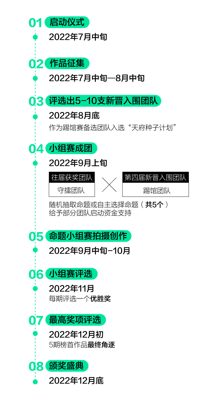 為鼓勵(lì)視頻創(chuàng)作,2022年將繼續(xù)啟動(dòng)“天府種子計(jì)劃”,高標(biāo)準(zhǔn)、高質(zhì)量生產(chǎn)以成都為主題/背景的影像IP。該計(jì)劃將通過(guò)“揭榜掛帥”的模式,發(fā)布5-10個(gè)提供啟動(dòng)資金的“種子”項(xiàng)目,通過(guò)邀請(qǐng)社會(huì)報(bào)名、機(jī)構(gòu)推薦的形式,征集評(píng)選出視頻行業(yè)有潛力的承接團(tuán)隊(duì)、個(gè)人。主辦方將組織專業(yè)評(píng)審對(duì)入圍團(tuán)隊(duì)/個(gè)人遞交的資料進(jìn)行評(píng)議打分,選出各個(gè)“種子”項(xiàng)目的承接方并予以執(zhí)行。